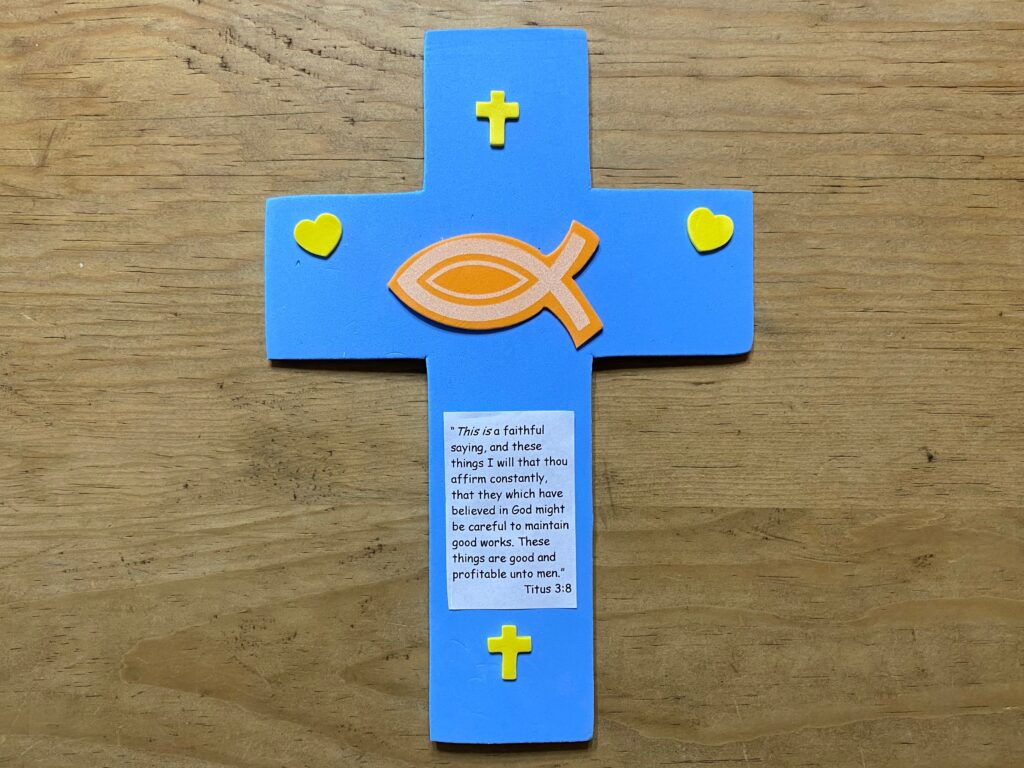 We decorated a foam cross with stickers and the Key Verse for this lesson.