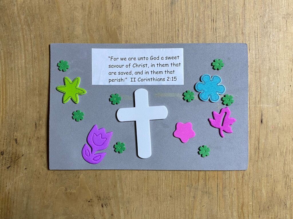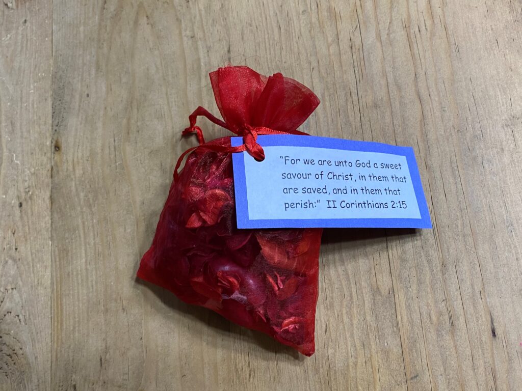 One time, we filled a bag with sweet smelling potpourri and attached a tag with verse 2 Corithians 2:15 to help them remember the importance of living a Christ-like life others would recognize. Another time, we decorated a foam sheet with stickers to hang somewhere with the same verse to help them remember.