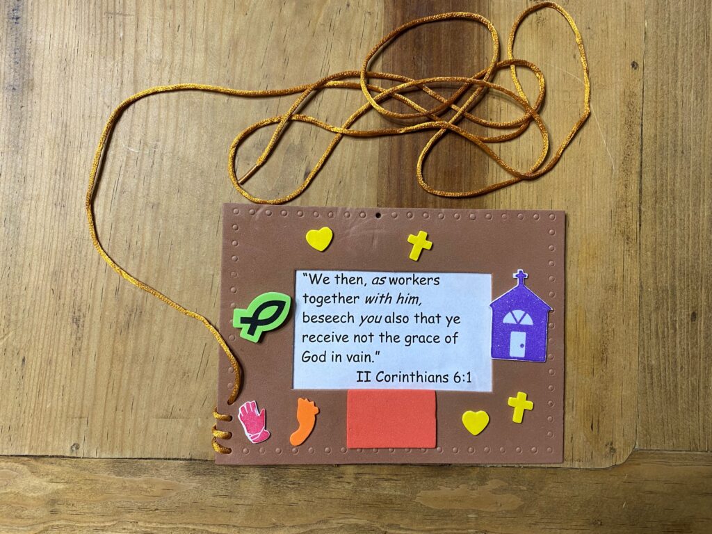 We laced a frame for the verse from 2 Corinthians 6:1. We then added stickers to complete it.